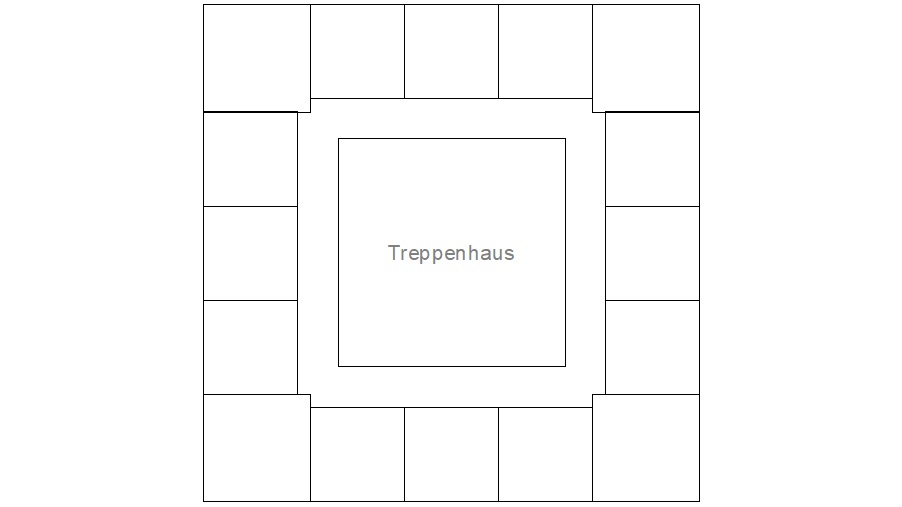 Das Video zeigt ein Standbild für einen Grundriss von einem so genannten Genesungsheim. Hierbei sind die Wohnungen und das Treppenhaus besonders angeordnet zur besseren Erfassung. Ein Gebäude besteht dabei aus 2 Stockwerken mit jeweils 16 2-Zimmer-Wohnungen. Ein Erdgeschoss und ein Dachgeschoss können zusätzlich gebaut werden. Das Schlafzimmer kann als Abstellraum mitbenutzt werden (ein Abstellraum ohne Fenster ist bei Gebäuden mit 20 Wohnungen oder mehr notwendig). |