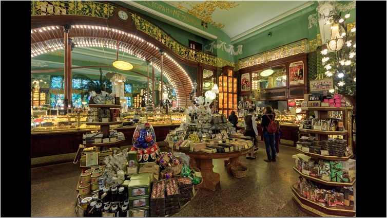 Das Video zeigt ein Standbild vom Feinkostladen Jelissejew. Es handelt sich um den Ladenbereich aus dem Inneren des Gebäudes.