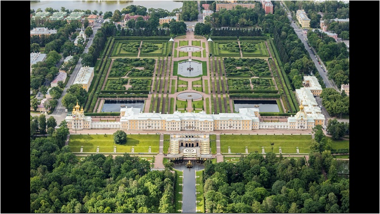 Das Video zeigt ein Standbild von Schloss Peterhof. Die Aufnahme ist von oben fotografiert und zeigt die gesamte Schlossanlage.