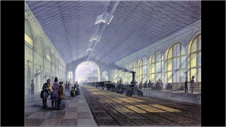 Das Video zeigt ein Standbild vom Moskauer Bahnhof. Es handelt sich um die Bahnhofshalle. Die Aufnahme stammt aus dem Jahr 1851.