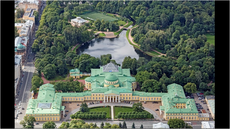 Das Video zeigt ein Standbild vom Taurischen Palais. Es handelt sich um ein Gebäude in der Nähe vom Smolny Institut 5 Kilometer östlich von Sankt Petersburg. Die Aufnahme ist von oben fotografiert.