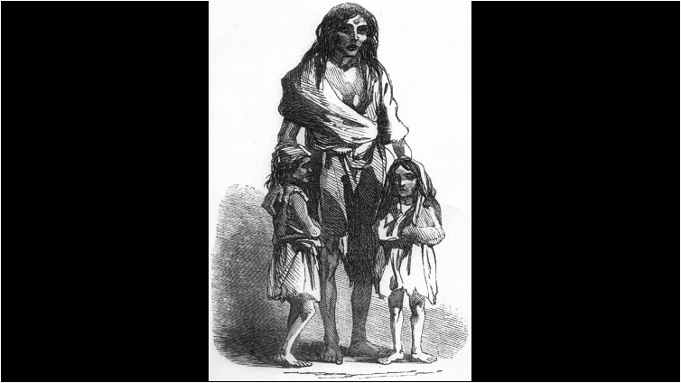 Ein Bild von "verarmtem" Landadel in Irland aus dem Jahr 1849. Es handelt sich um eine Mutter mit ihren zwei Kindern.