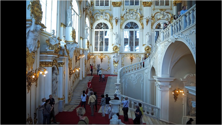 Das Video zeigt ein Standbild vom Haupteingang des Winterpalastes. Dieser wird auch Jordantreppe genannt. Der Jordan ist ein Fluss bei Israel und mündet in das Tote Meer.