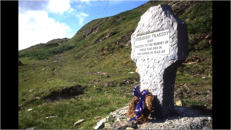 Ein Denkmal im irischen Fischerdorf Doolough. Das Denkmal erinnert an 7 tote Leute aus dem Jahr 1849, welche ihre Unterkünfte (Arbeitshäuser) eines Abends nicht mehr erreichten (darunter auch Frauen und Kinder). Die Leichen wurden an einem See entdeckt. Eigentlich sollten 2 angestellte Personen die Bewohner kontrollieren. |