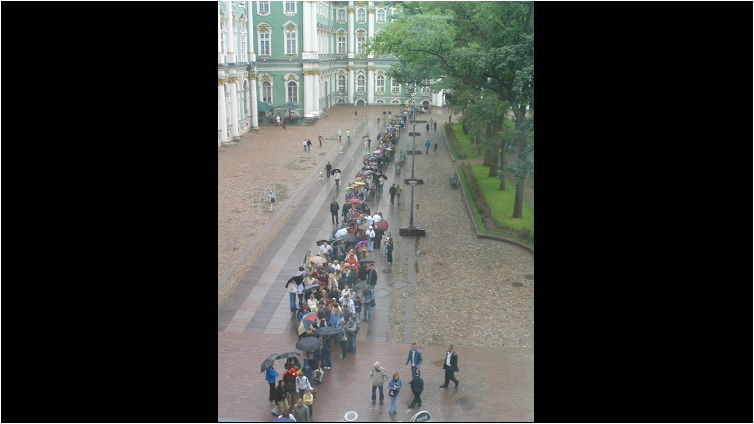 Das Video zeigt ein Standbild von einer Menschenschlange vor dem Haupteingang des Winterpalastes. Im Winterpalast befindet sich eine Bildergalerie.