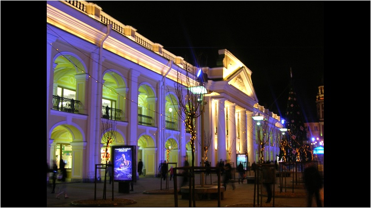 Das Video zeigt ein Standbild von Gostiny Dwor. Es handelt sich um das zweitgrößte Warenhaus in Russland. Auf deutsch bedeutet Gostiny Dwor Gasthof.